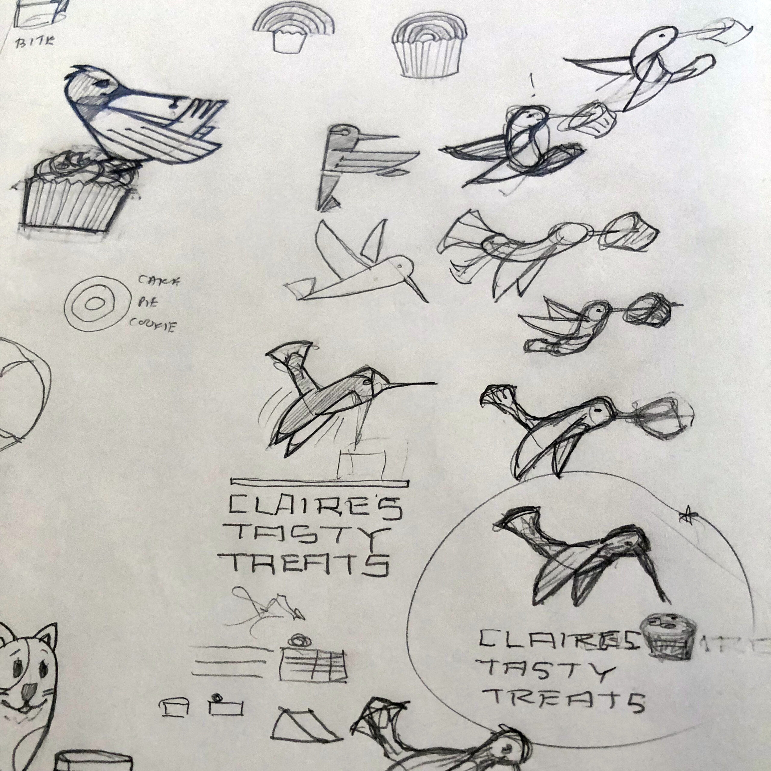 Evolving through names during the sketching stage led me to the idea that the floral decoration on a cupcake might look so tasty that even a hummingbird would be drawn to it.