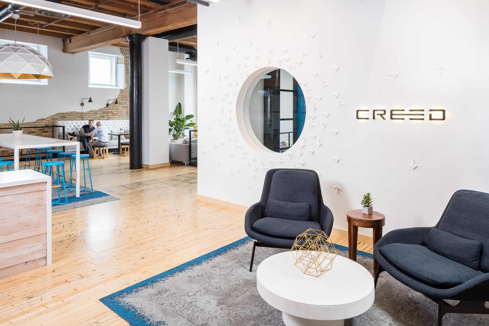 Co-founder, Stacy Anderstrom who led the interior design for the Creed offices incorporated the logo on warm, reclaimed wood in the entry, and warmly backlit in the reception area to subtly reinforce the comfort she and Jonathan intended to provide for clients and employees alike.