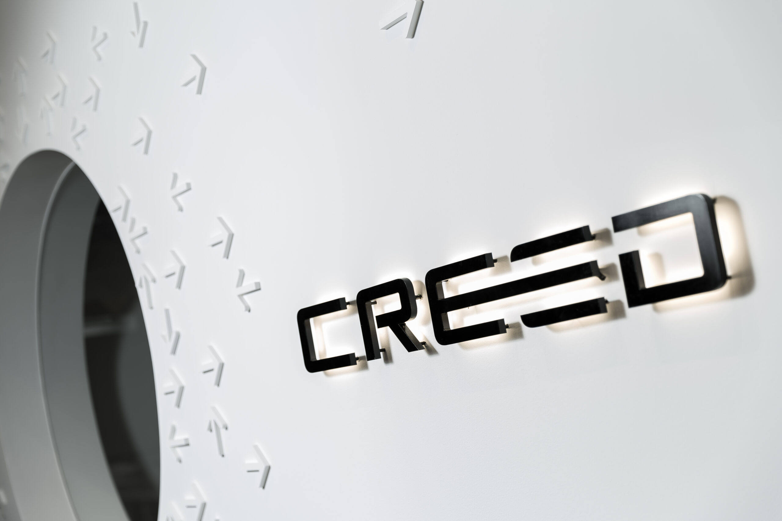 The C shape is composed of four overlapping layers that evoke Creed’s ability to layer into another organization. The fan-like gray gives the overall shape the suggestion of motion or release of energy. The color and composition convey a crystalline precision and also signify the contributions by different disciplines to a unified whole.